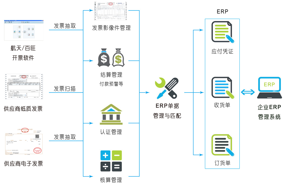 稅航增值稅進項發(fā)票管理解決方案,利用從業(yè)務系統(tǒng)的供應商信息中抽取的數(shù)據(jù)和掃描發(fā)票獲得的數(shù)據(jù),通過稅航進項發(fā)票管理平臺及稅控數(shù)據(jù)接口,實現(xiàn)自動識別認證、生成增值稅進項明細表,徹底消除進項發(fā)票流程中的重復勞動,保證進項數(shù)據(jù)的正確性和一致性,統(tǒng)一管理增值稅數(shù)據(jù)和業(yè)務數(shù)據(jù),實現(xiàn)靈活對比查詢,輕松轉(zhuǎn)換成企業(yè)ERP采購訂單或者應付憑證。更多進項報表可通過發(fā)票管理平臺統(tǒng)一生成,客觀、真實、及時 。實現(xiàn)原理圖如下: